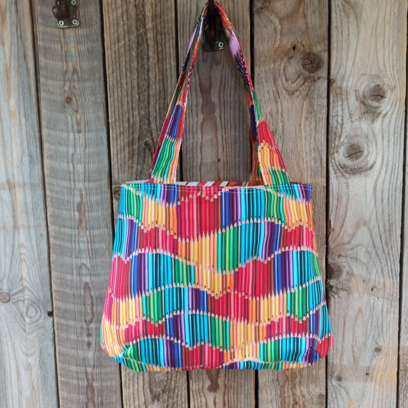 Naai super eenvoudig deze omkeerbare (kinder)tas met verschillende afbeeldingen van potloden. De tas is gevoerd en hierdoor omkeerbaar, maar je kunt ook kiezen om deze te voeren met een andere stof, waardoor je 2 tassen maakt met dit paneel.