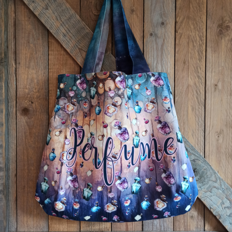 Maak deze kleurrijke tas, met afbeeldingen van parfum flesjes van Stenzo stof, helemaal zelf. Eenvoudig te maken. De tas bestaat uit 4 verschillende digitaal geprinte panelen. Je bepaalt zelf hoe je de tas samenstelt. De tas is omkeerbaar. Je kunt er ook voor kiezen om een andere voeringstof te gebruiken, zodat je 2 tassen hebt. Hoe leuk is deze tas als cadeau?