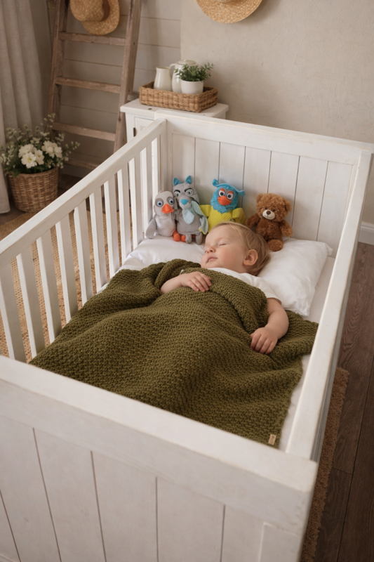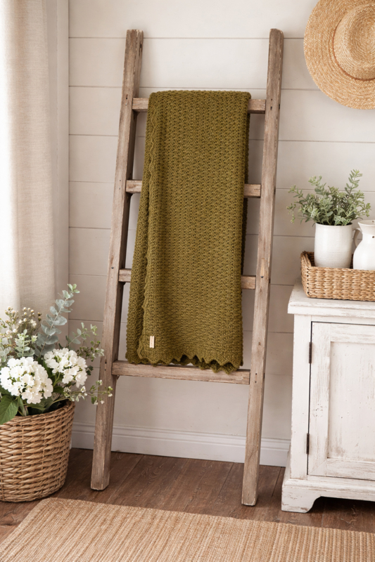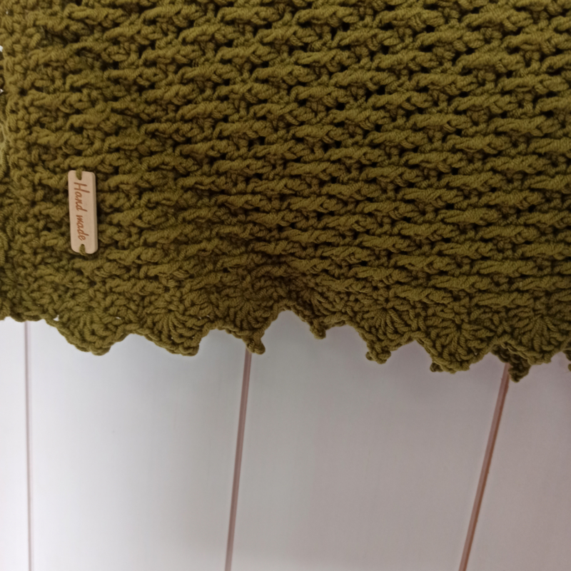 Gehaakt dekentje van 110x130cm in Pickle. Gemaakt met soft scheepjes, dus heerlijk zacht. Het materiaal is licht van gewicht en heeft de ademende eigenschappen van katoen. Afgewerkt met een label en een gehaakte punt rand.
