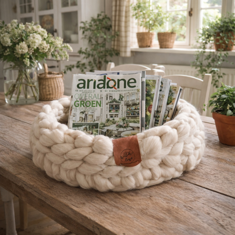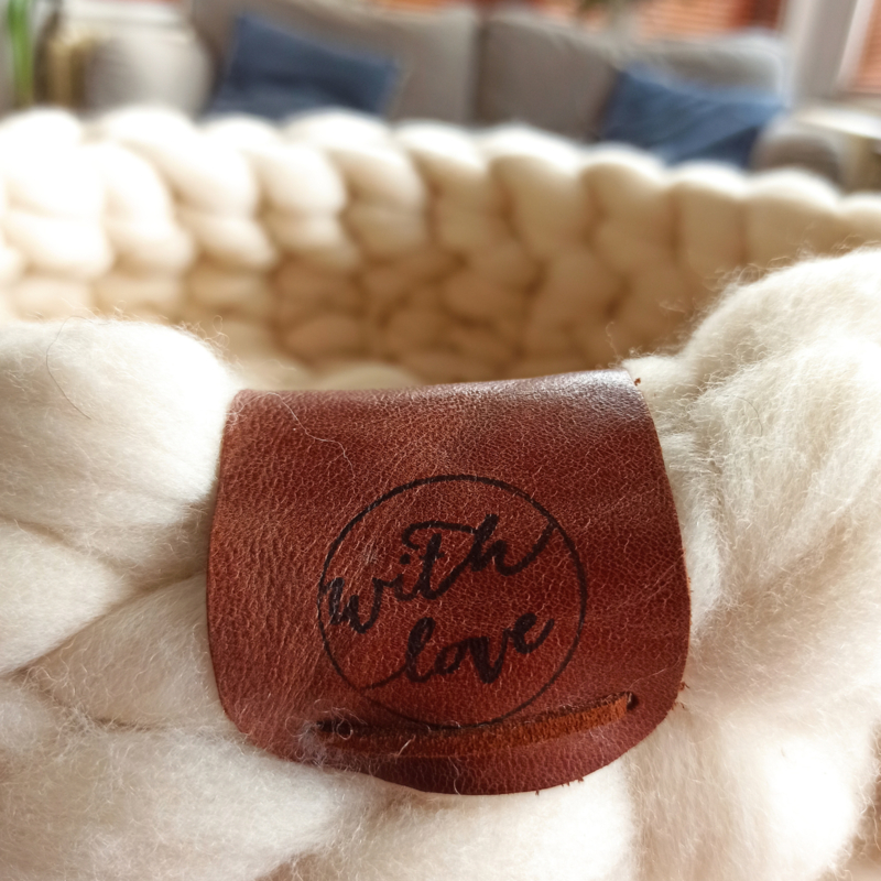 Van heerlijk zachte lontwol in ivoor kleur, dus ongeverfd, is deze stoere mand gehaakt. Katten zijn er vaak dol op, maar ook eigenwijs natuurlijk. De mand is afgewerkt met een handgemaakte leren label.
