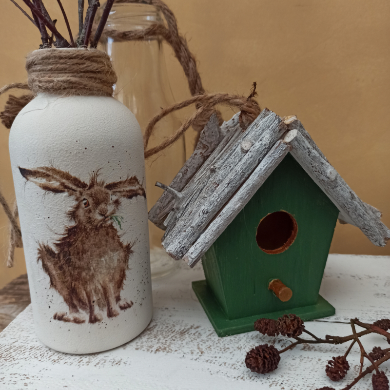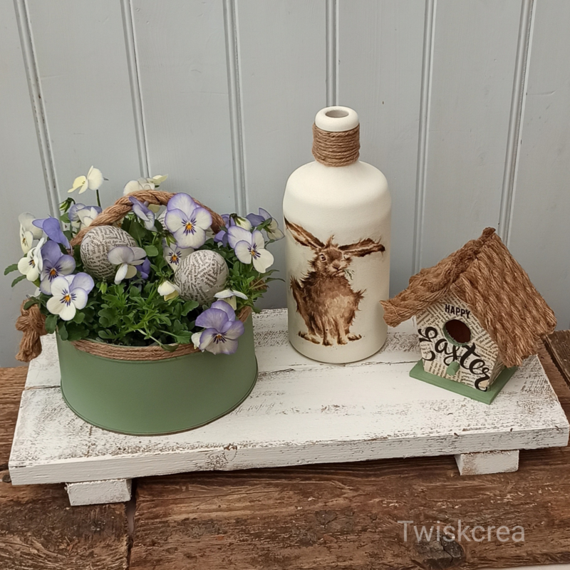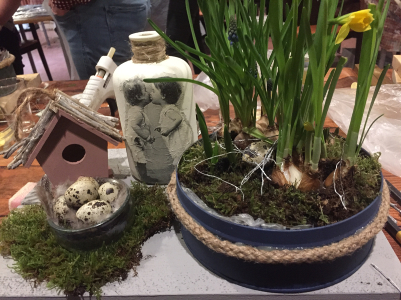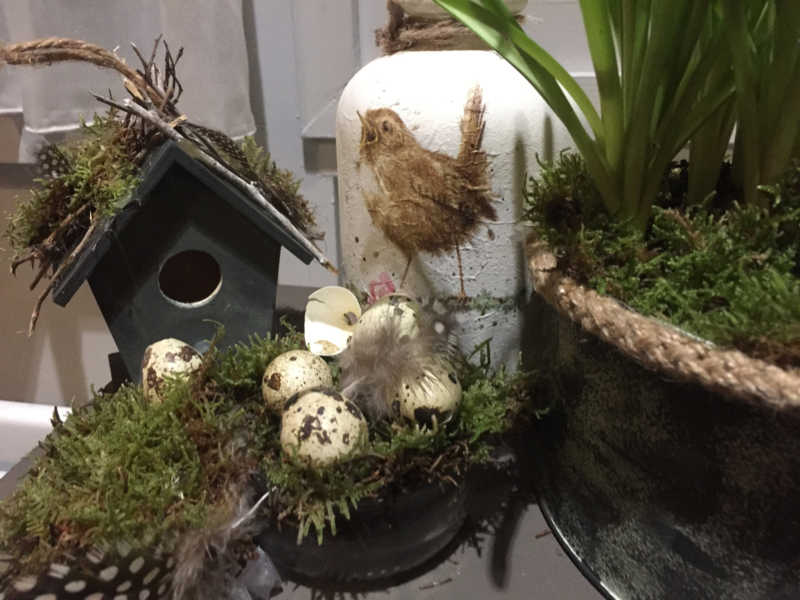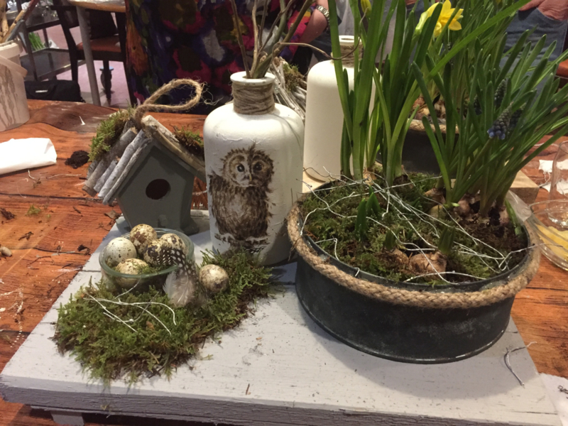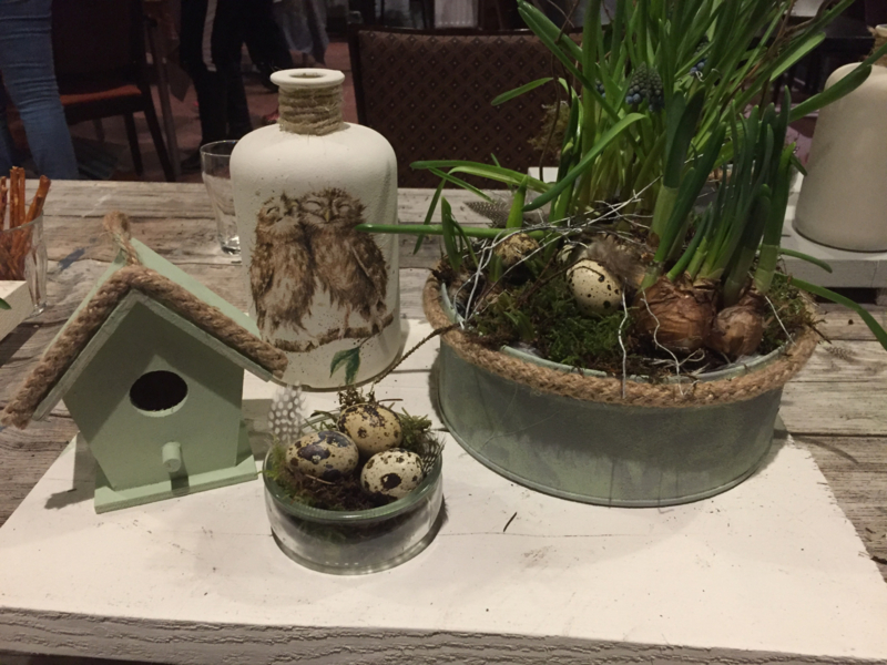 Hierop komt een vaas waarop een afbeelding kan worden gemaakt, een houten vogelhuisje naar wens te verven en te decoreren en een plantenbakje (gerecyclede koektrommel) gevuld met bolletjes en/of plantjes die ik op dat moment kan krijgen.